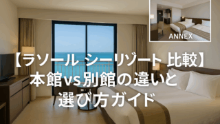 ホテル 沖縄 【ラソール シー リゾート 比較】本館vs別館の違いと選び方ガイド ラソール シー リゾートの本館と別館ANNEXを徹底比較。客室の広さ・施設・ペット可否・価格帯の違いを解説し、読者に合う選び方をガイドします。 2025.09.26 ホテル 沖縄沖縄 ホテル 比較