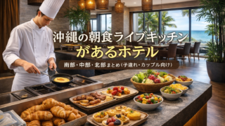 沖縄で朝食ライブキッチン(目の前調理)が楽しめるホテルを、南部・中部・北部エリア別に厳選。子連れ/カップル向けにおすすめ度★、混雑のコツや立地も比較。楽天・じゃらん等の掲載情報を出典に紹介します。